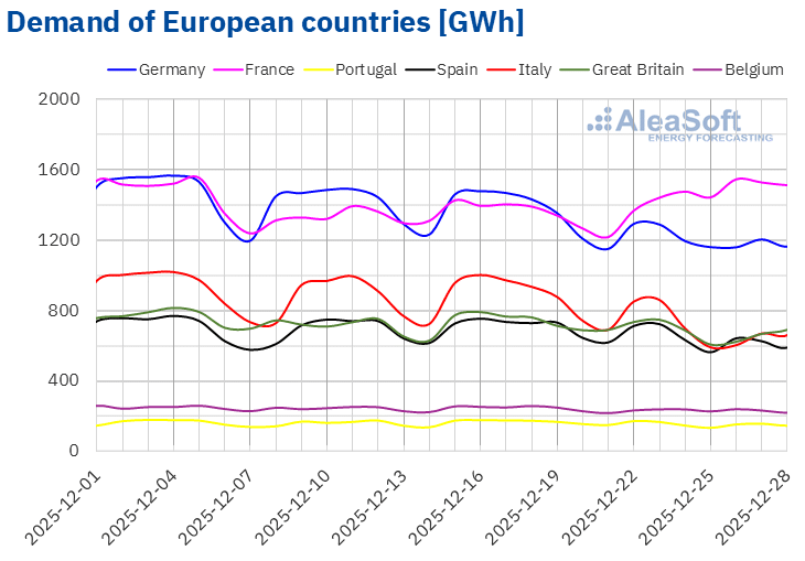 For the week of December 29, according to AleaSoft Energy Forecasting’s demand forecasts, the negative trend will reverse and demand will increase in the German, Spanish, British, Belgian and French markets. However, demand will continue to decrease in the Italian and Portuguese markets.