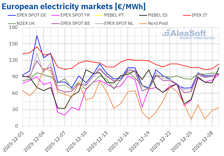 AleaSoft Energy Forecasting, December 29, 2025. In the fourth week of December, prices in most major European electricity markets declined compared to the previous week, with weekly averages below €85/MWh. Lower demand during the Christmas holidays, together with higher wind and solar energy production, drove this decrease. Photovoltaic energy reached all‑time highs for a December day in Germany, Italy and France. Meanwhile, CO₂ futures registered their highest settlement price at least since October 2024.