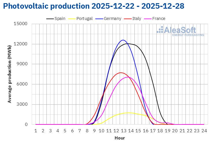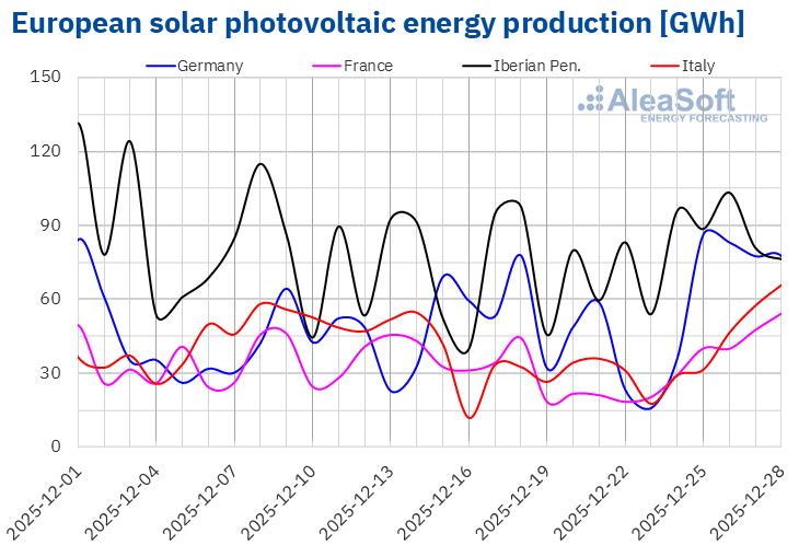 During the week of December 29, according to AleaSoft Energy Forecasting’s solar energy forecasts, production will increase in the Italian and Spanish markets compared to the previous week. By contrast, solar energy production will decline in the German market.