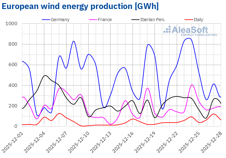 In the week of December 29, according to AleaSoft Energy Forecasting’s wind energy forecasts, production from this technology will increase in the German and Italian markets. By contrast, it will decrease in the Spanish, French and Portuguese markets.