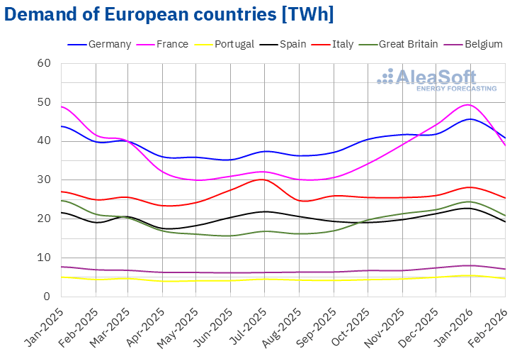 Im Februar 2026 stieg der Strombedarf in den meisten wichtigen europäischen Märkten im Vergleich zum Vorjahreszeitraum an. Der portugiesische Markt verzeichnete mit 5,3 % den stärksten Anstieg, während der spanische Markt mit 1,0 % den geringsten Zuwachs verzeichnete. Der italienische Markt verzeichnete einen Anstieg von 1,8 %, und die Nachfrage auf dem deutschen und dem belgischen Markt stieg jeweils um 2,5 %. Im Gegensatz dazu verzeichneten der britische und der französische Markt im Vergleich zum Vorjahr Rückgänge von 1,7 % bzw. 6,4 %.