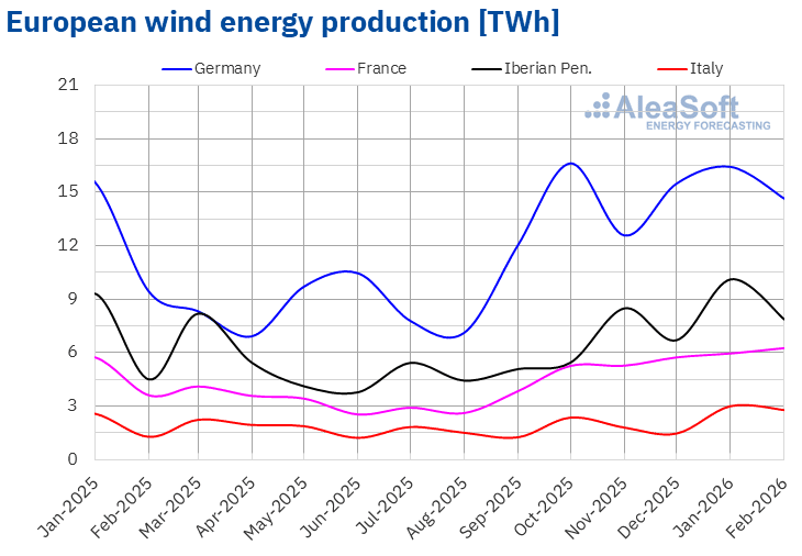 Im Februar 2026 verzeichneten die Märkte in Frankreich, Italien und Portugal mit 6247 GWh, 2770 GWh bzw. 1636 GWh ihre höchsten Windstromproduktionen für einen Februar.
