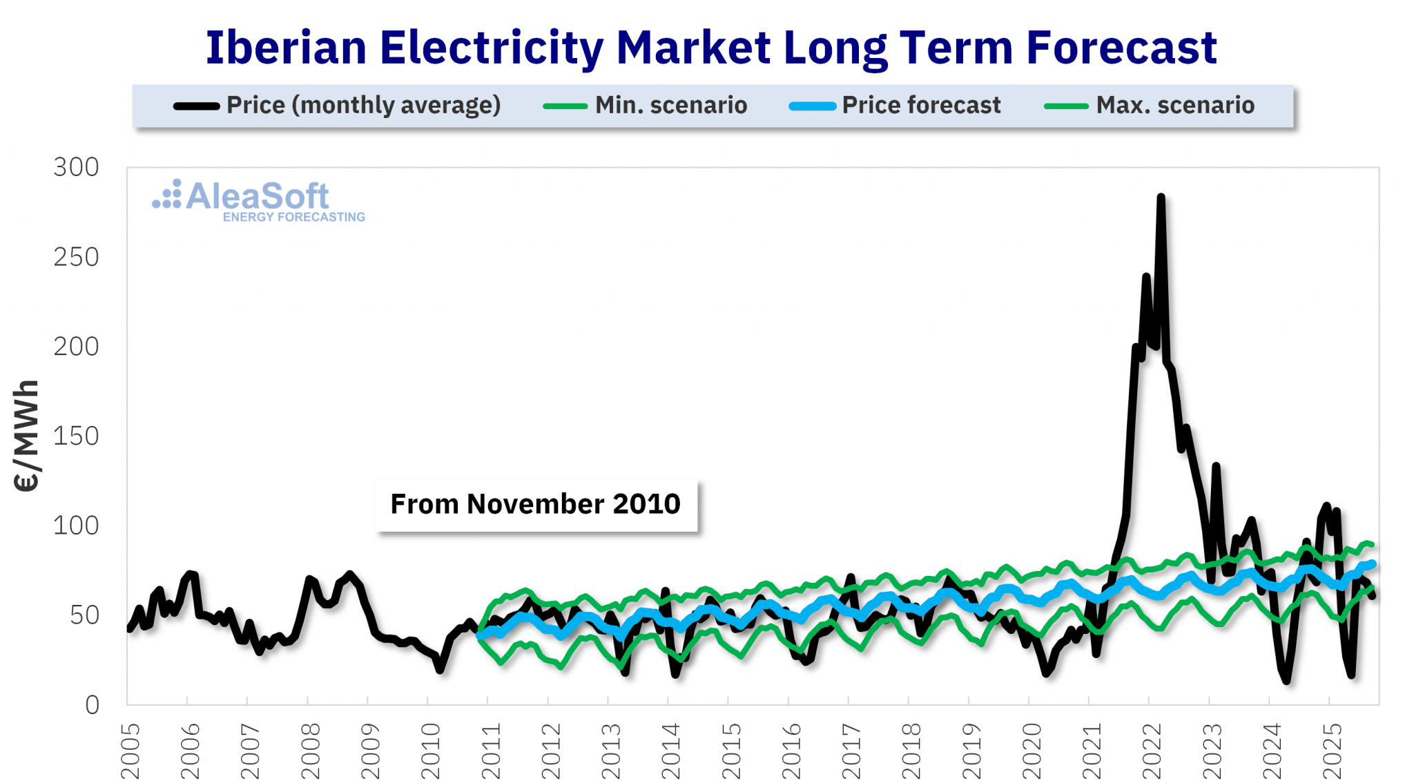 Langfristige Preisprognose für den iberischen MIBEL-Strommarkt, erstellt von AleaSoft Ende Oktober 2010.Quelle: AleaSoft Energy Forecasting.