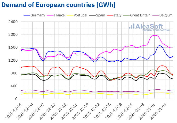 Für die Woche vom 12. Januar wird laut den Nachfrageprognosen von AleaSoft Energy Forecasting der Aufwärtstrend der Nachfrage auf den Märkten in Deutschland, Spanien und Italien anhalten. Im Gegensatz dazu werden die Märkte in Frankreich, Portugal, Großbritannien und Belgien einen Rückgang der Nachfrage verzeichnen.