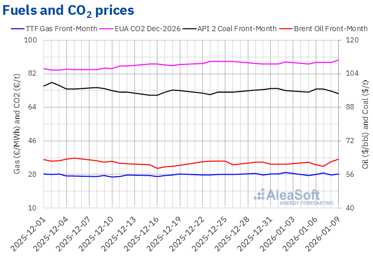 Quelle: Erstellt von AleaSoft Energy Forecasting unter Verwendung von Daten von OMIE, EPEX SPOT, Nord Pool und GME.Brent, Kraftstoffe und CO2