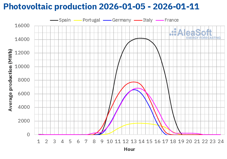 In der Woche vom 5. Januar stieg die Photovoltaik-Produktion auf den Märkten der Iberischen Halbinsel im Vergleich zur Vorwoche. Der spanische Markt verzeichnete mit 39 % den größten Anstieg, während der portugiesische Markt einen Anstieg von 16 % verzeichnete. Dagegen verzeichneten der italienische, deutsche und französische Markt Rückgänge bei der Stromerzeugung mit dieser Technologie. Italien und Frankreich verzeichneten nach zwei Wochen mit Zuwächsen Rückgänge von 8,8 % bzw. 26 %. Deutschland verzeichnete mit einem Rückgang von 23 % die zweite Woche in Folge mit Rückgängen.