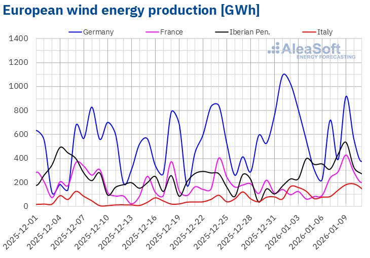 Für die zweite Januarwoche wird laut den Prognosen zur Windenergieproduktion von AleaSoft Energy Forecasting die Produktion mit dieser Technologie auf dem deutschen Markt steigen. Auf den Märkten in Italien, Spanien, Portugal und Frankreich wird jedoch ein Rückgang erwartet, was eine Trendwende gegenüber der Vorwoche bedeutet.