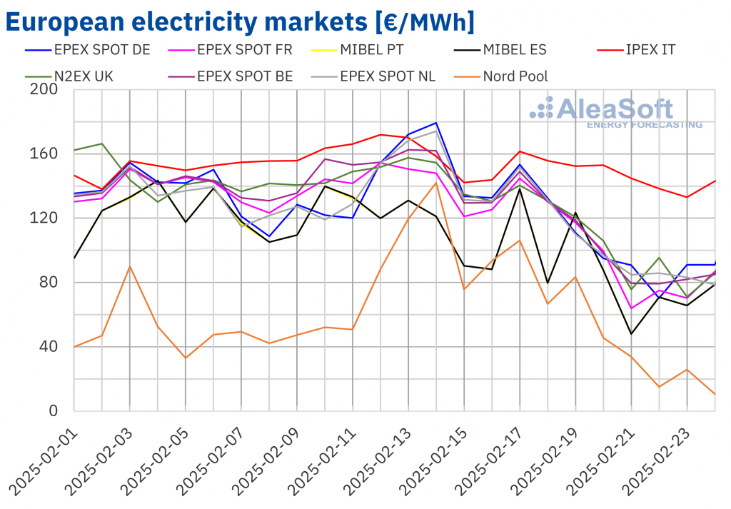 AleaSoft Energy Forecasting, 24. Februar 2025. In der dritten Februarwoche fielen die Preise auf den wichtigsten europäischen Strommärkten, wobei die meisten von ihnen einen Wochendurchschnitt von unter 110 €/MWh erreichten. Mehrere Faktoren trugen zu diesen Rückgängen bei. Zum einen der Rückgang der Gas- und CO2-Preise sowie der Rückgang der Nachfrage. Andererseits die Zunahme der Produktion […]