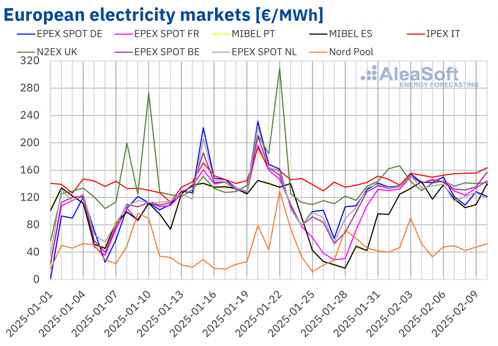 AleaSoft Energy Forecasting, 10. Februar 2025. In der ersten Februarwoche stiegen die TTF-Gas-Terminpreise weiter an und erreichten am Ende der Woche den höchsten Abrechnungspreis der letzten zwei Jahre. Vor diesem Hintergrund und in Verbindung mit einer geringeren Windenergieproduktion und einer höheren Nachfrage stiegen die Preise auf den wichtigsten europäischen Strommärkten, wobei die meisten Wochendurchschnitte über […]