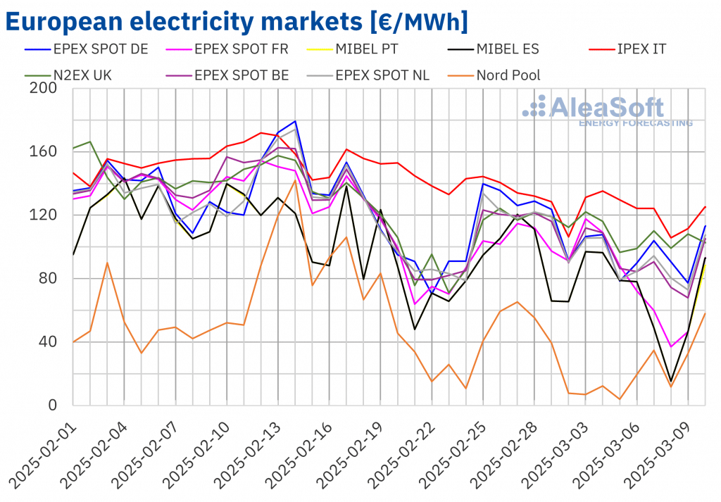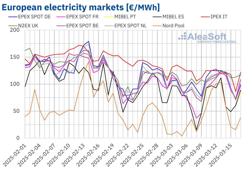 AleaSoft Energy Forecasting, 17. März 2025. In der zweiten Märzwoche lagen die Wochenpreise in den meisten großen europäischen Strommärkten über 100 €/MWh und damit höher als in der Vorwoche. Eine höhere Stromnachfrage, verbunden mit kälteren Temperaturen, und eine im Vergleich zur Vorwoche geringere Wind- und Fotovoltaikproduktion auf den meisten Märkten begünstigten dieses Verhalten. Außerdem stiegen […]