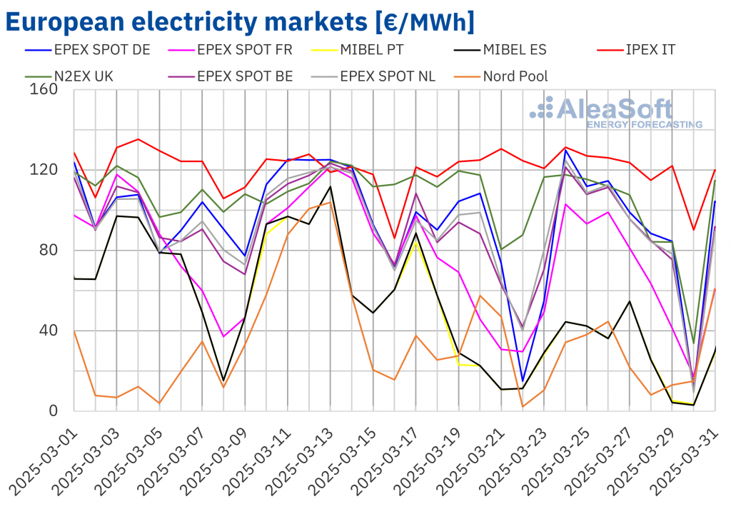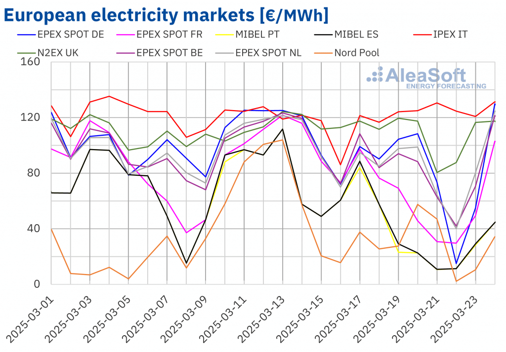 AleaSoft Energy Forecasting, 31. März 2025. In der letzten Märzwoche sind die Preise auf den meisten großen europäischen Strommärkten gefallen. Die rückläufige Nachfrage und die sinkenden Gas- und CO2-Preise waren der Grund für diese Rückgänge. Im Gegensatz dazu führte der Rückgang der Windenergieproduktion auf einigen Märkten zu einem Preisanstieg. Der Anstieg der Fotovoltaikproduktion führte dazu, […]