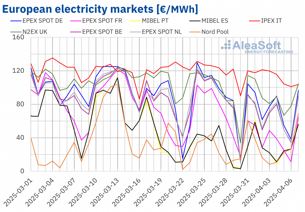 AleaSoft Energy Forecasting, 7. April 2025. In der ersten Aprilwoche waren die Preise auf den meisten großen europäischen Strommärkten niedriger als in der Vorwoche, mit Durchschnittspreisen unter 75 €/MWh in fast allen Märkten. Die Erzeugung erneuerbarer Energien stieg auf mehreren Märkten. Die Fotovoltaik stellte in Italien einen neuen Rekord bei der Tagesproduktion auf, ebenso wie […]