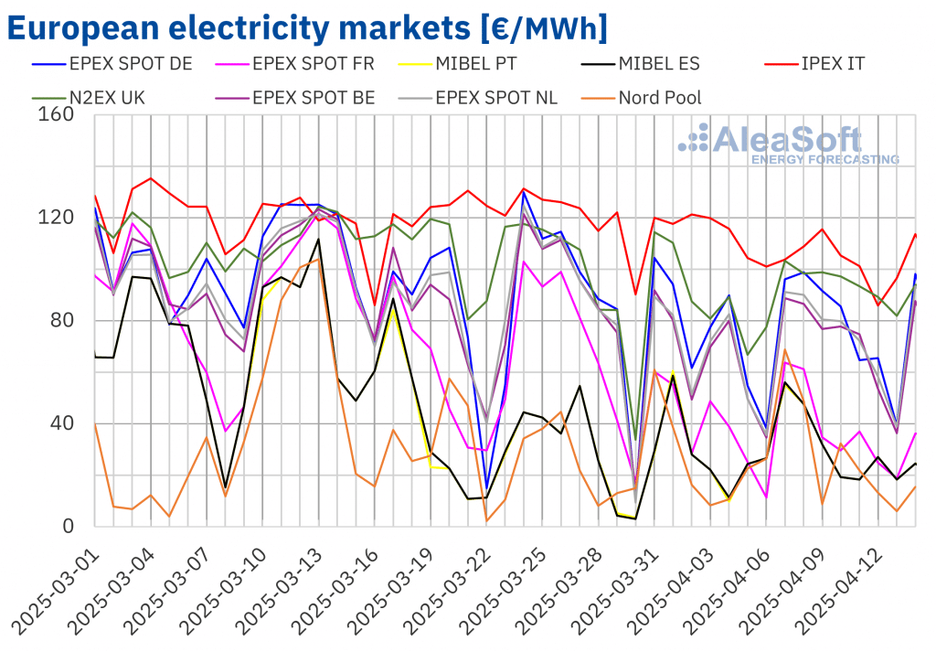 AleaSoft Energy Forecasting, 14. April 2025. In der zweiten Aprilwoche blieben die Preise auf den wichtigsten europäischen Strommärkten auf einem ähnlichen Niveau wie in der Vorwoche, mit leicht höheren Wochendurchschnitten. Der Rückgang der Windenergieproduktion begünstigte dieses Verhalten. Auf der anderen Seite nahm die Photovoltaik zu und erreichte in Frankreich und Italien einen neuen Rekord bei […]
