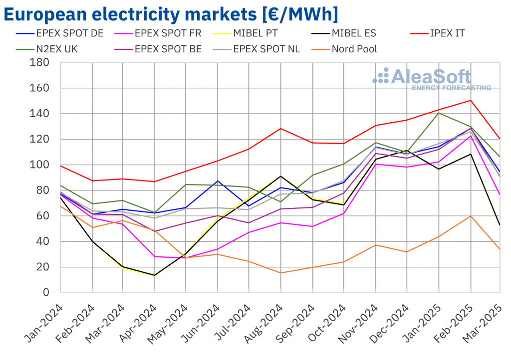 AleaSoft Energy Forecasting, 1. April 2025. Im ersten Quartal 2025 stiegen die Preise in den meisten großen europäischen Strommärkten. Auf mehreren Märkten war der vierteljährliche Durchschnittspreis der höchste seit dem zweiten Quartal 2023. Einer der Hauptgründe für diesen Anstieg war der Anstieg der Gaspreise, deren Quartalsdurchschnitt ebenfalls der höchste seit diesem Zeitpunkt war. Steigende CO2-Preise […]