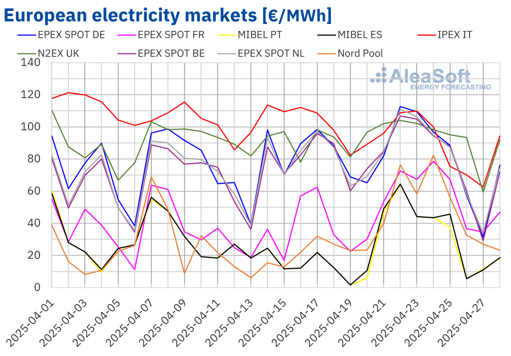 AleaSoft Energy Forecasting, 29. April 2025. In der Woche bis zum 21. April stiegen die Preise auf den meisten großen europäischen Strommärkten im Vergleich zur Vorwoche, insbesondere in den ersten Tagen der Woche. Grund für den Anstieg war die rückläufige Windstromproduktion. Am Ende der Woche fielen die Preise. Am Sonntag, den 27. April, erreichte Italien […]