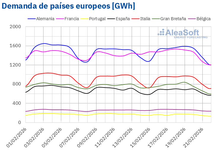 Para la semana del 23 de febrero, según las previsiones de demanda de AleaSoft Energy Forecasting, la demanda disminuirá en los mercados alemán, francés, italiano, británico y belga. En cambio, en España y Portugal se prevé un aumento.