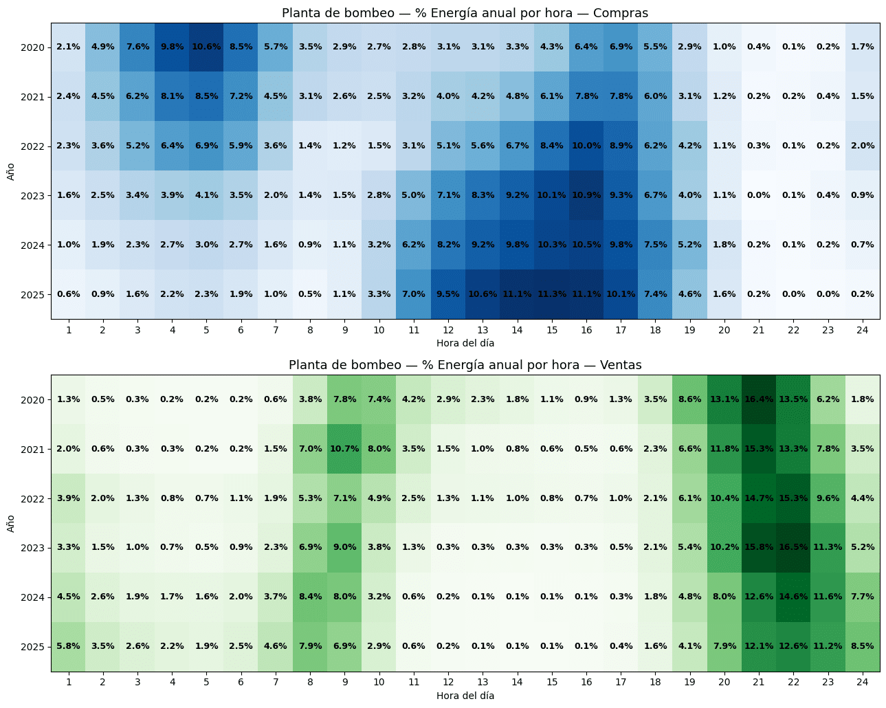 En cuanto a las ventas, la concentración es mucho más estable y claramente orientada hacia el final de la jornada, con los mayores porcentajes de energía anual situándose de forma recurrente entre las 21:00 y las 22:00 horas y valores típicos en el entorno del 13% al 17% del total anual. Aunque existen volúmenes secundarios en otras horas, la descarga principal se concentra de forma consistente en la franja de tarde y noche, coincidiendo con el pico de demanda y de precios.