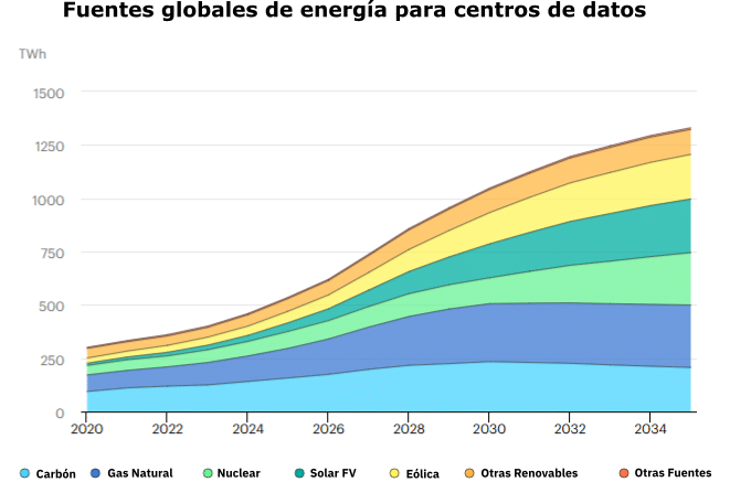 Se espera que hasta 2030 el gas natural y el carbón cubran el 40% de la demanda proveniente de estos centros. Además, sirven como impulsores de estos combustibles, creando demanda y financiando nuevas plantas.