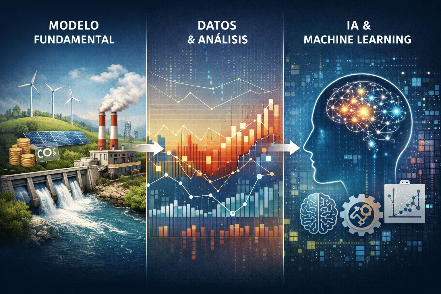 AleaSoft Energy Forecasting, 6 de marzo de 2026. En los mercados eléctricos, muchos modelos fundamentales fallan no por la física del sistema, sino por no reproducir el equilibrio real que fija el precio. Un enfoque híbrido que combina estructura fundamental con modelos estadísticos, Inteligencia Artificial y Machine Learning permite capturar dinámicas temporales, no linealidades y cambios de régimen, mejorando la señal de precio y su distribución para decisiones de inversión y cobertura.