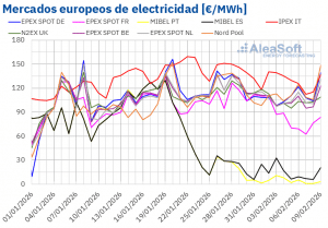 AleaSoft Energy Forecasting, 16 de febrero de 2026. En la segunda semana de febrero, los precios de la mayoría de los principales mercados eléctricos europeos