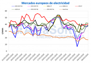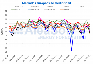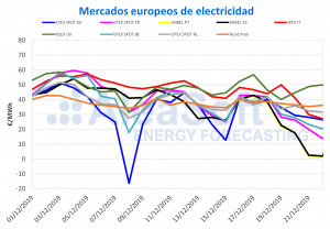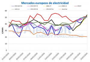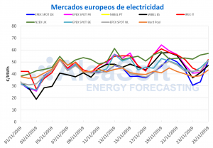 AleaSoft, 23 de enero de 2020. Los precios de los mercados eléctricos europeos subieron, destacando los del mercado EPEX SPOT con aumentos de más de 10 €/MWh,