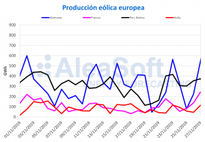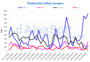 AleaSoft, 30 de enero de 2020. La producción eólica se incrementó esta semana en todos los mercados europeos, lo que unido a una menor demanda