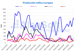 AleaSoft, 16 de enero de 2020. La producción eólica subió considerablemente esta semana en la mayoría de los mercados europeos, lo que propició precios más