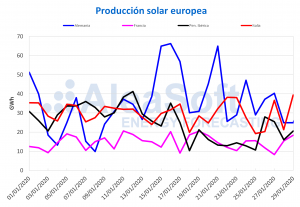 AleaSoft, 28 de noviembre de 2019. La producción solar ha disminuido esta semana en la mayoría de los mercados europeos, excepto en el italiano. La