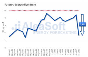 AleaSoft, 12 de julio 2018. El precio de los futuros de Brent se desploma alrededor de un 7% en pocas horas, y refuerza la desconfianza