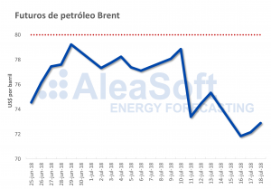 AleaSoft, 19 de julio 2018. Después de la brusca caída del pasado miércoles 11 de julio, el precio del barril de petróleo Brent ha continuado