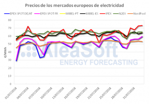 AleaSoft, 28 de junio 2018. Los precios de los mercados de España y Portugal se han posicionado como los más caros de Europa junto con