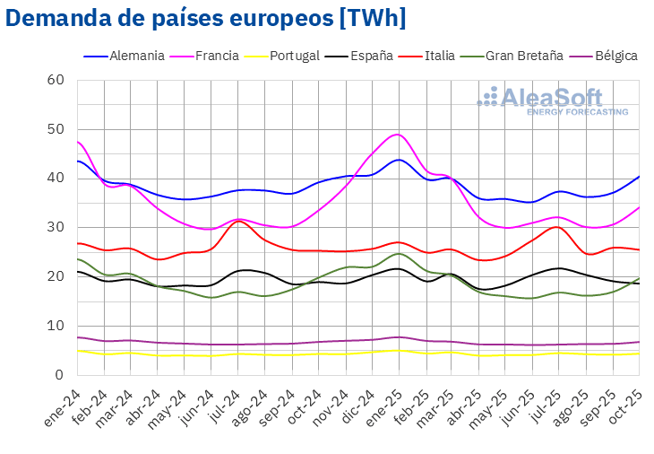 Fuente: Elaborado por AleaSoft Energy Forecasting con datos de ENTSO-E, RTE, REN, Red Eléctrica y TERNA.Demanda eléctrica
