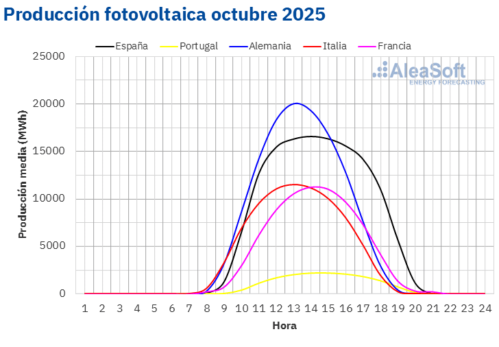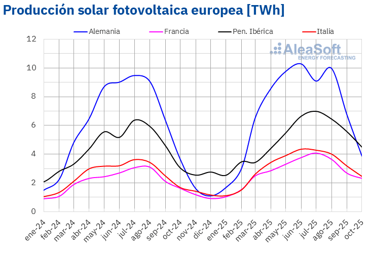 Los principales mercados europeos registraron récords históricos de producción solar fotovoltaica para un mes de octubre. España registró la mayor producción, de 3992 GWh, seguido de Alemania con una generación de 3865 GWh. Italia, Francia y Portugal registraron producciones de 2464 GWh, 2323 GWh y 497 GWh, respectivamente.