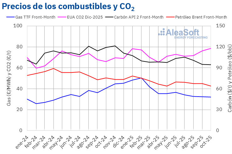 AleaSoft Energy Forecasting, 4 de noviembre de 2025. Los precios subieron en octubre en la mayoría de los principales mercados eléctricos europeos, superando los 75 €/MWh y situándose por encima de los niveles de septiembre. En el mercado ibérico se alcanzó el precio mensual más alto desde marzo. El aumento de la demanda eléctrica y la subida de los precios del CO2, que marcaron su promedio mensual más elevado desde diciembre de 2023, impulsaron esta tendencia alcista. En cambio, los futuros del gas y del petróleo Brent descendieron hasta sus promedios mensuales más bajos desde mayo de 2024 y marzo de 2021, respectivamente. Mientras tanto, la fotovoltaica y la eólica marcaron récords de producción para un mes de octubre en gran parte de los mercados.