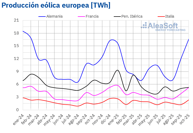 En octubre de 2025, tres de los mercados analizados registraron récords históricos de producción eólica para un mes de octubre. El mercado alemán generó 16 630 GWh. El mercado francés produjo 5254 GWh y el mercado italiano registró 2351 GWh de producción con esta tecnología.