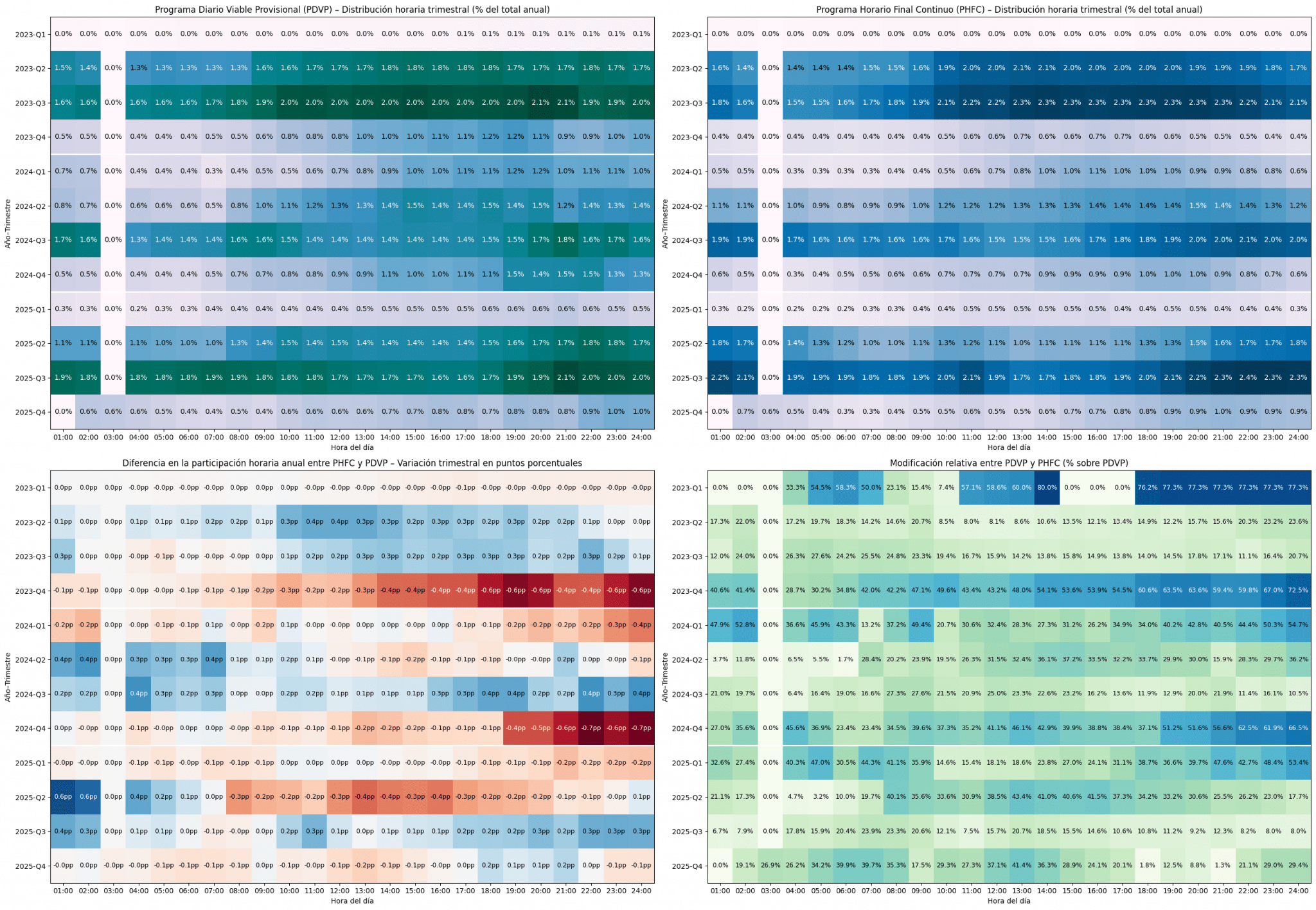 En la parte superior de la imagen se muestra, para cada hora del día, la distribución horaria de la energía programada de la planta termosolar, expresada como porcentaje del total anual en PDVP y PHFC, desagregada por trimestres para el período 2023-2025. Los resultados muestran que la estructura horaria del PHFC no es una réplica exacta del PDVP. Aunque comparten una base común, aparecen desplazamientos sistemáticos de participación entre determinadas franjas horarias que se repiten a lo largo de los años incluidos en el análisis. En algunos trimestres se refuerzan las horas centrales y vespertinas en el programa final, asociado a procesos de reprogramación intradiaria motivados por la actualización de las condiciones operativas y del recurso disponible.