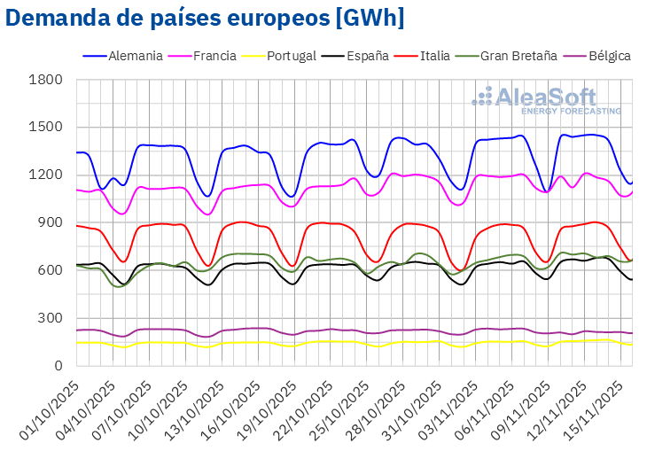AleaSoft Energy Forecasting, 17 de noviembre de 2025. En la segunda semana de noviembre, los precios bajaron en la mayoría de los principales mercados eléctricos europeos en comparación con la semana anterior, gracias al aumento de la producción eólica y al descenso de los precios del gas. El 13 de noviembre los futuros del gas TTF registraron el precio de cierre más bajo desde mayo de 2024, de 30,46 €/MWh. La demanda eléctrica creció en la mayor parte de los principales mercados de Europa mientras que la producción solar fotovoltaica bajó.