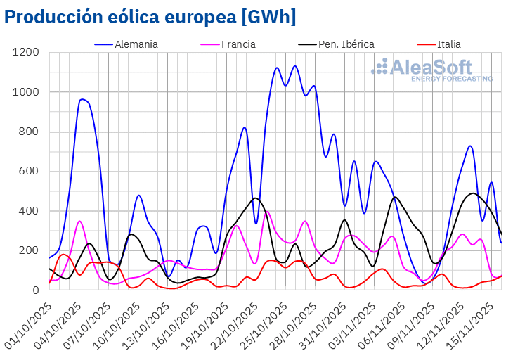 Fuente: Elaborado por AleaSoft Energy Forecasting con datos de ENTSO-E, RTE, REN, Red Eléctrica y TERNA.En la segunda semana de noviembre, la producción eólica aumentó en la mayoría de los principales mercados de electricidad de Europa en comparación con la semana anterior. Los mercados de la península ibérica encadenaron dos semanas de incrementos. El mercado portugués registró el mayor incremento, del 53%, mientras que el mercado español presentó el menor aumento, del 17%. En los mercados de Francia y Alemania, la generación con esta tecnología aumentó un 29% y un 40%, respectivamente. En cambio, el mercado italiano mantuvo la tendencia descendiente por tercera semana consecutiva, con una bajada del 18%.