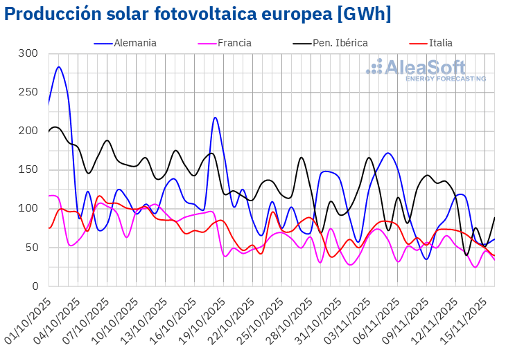 En la semana del 10 de noviembre, la producción solar fotovoltaica disminuyó en los principales mercados europeos respecto a la semana anterior. El mercado portugués registró el mayor descenso, del 45%, mientras que el mercado italiano mostró el menor, del 11%. Los mercados francés, español y alemán presentaron bajadas del 18%, 21% y 27%, respectivamente.