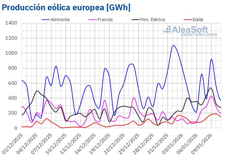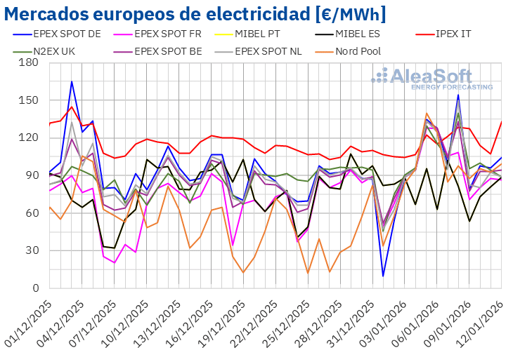 AleaSoft Energy Forecasting, 12 de enero de 2026. En la segunda semana de enero, los precios aumentaron en la mayoría de los principales mercados eléctricos europeos respecto a la semana anterior, impulsados por el crecimiento de la demanda, el aumento de precios del CO2, cuyos futuros marcaron su precio de cierre más alto al menos desde diciembre de 2023, y la menor producción renovable en algunos mercados. En cambio, el mercado ibérico registró los precios más bajos la mayor parte de la semana gracias al aumento de la producción eólica, que alcanzó un récord histórico diario, y de la solar. En Italia también se registraron récords históricos de producción eólica y de fotovoltaica para un día de enero.