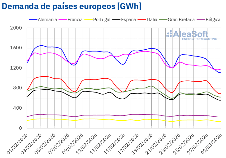 Fuente: Elaborado por AleaSoft Energy Forecasting con datos de ENTSO-E, RTE, REN, Red Eléctrica y TERNA.Demanda eléctrica