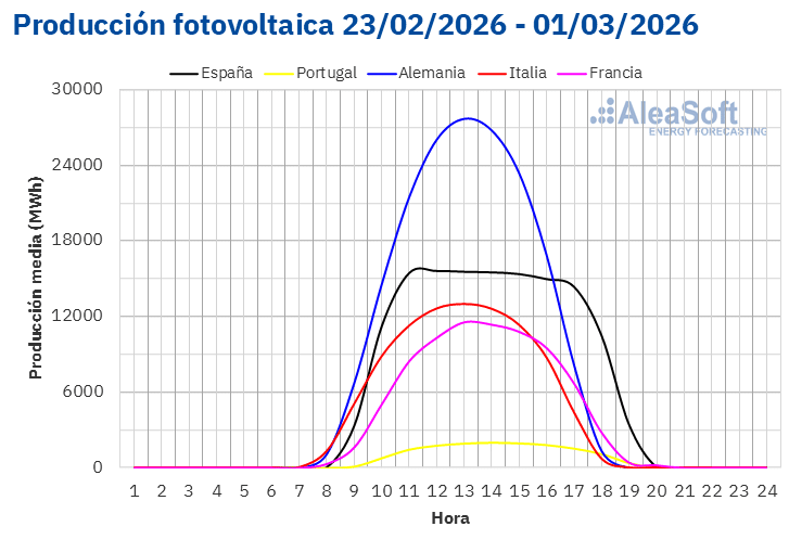 En la semana del 23 de febrero, la producción solar fotovoltaica aumentó en los principales mercados europeos en comparación con la semana anterior. El mercado alemán registró el mayor incremento, del 132%, seguido del mercado francés, donde aumentó un 52%. El mercado italiano registró el menor crecimiento, del 5,3%, y encadenó su quinta semana consecutiva al alza. En los mercados de la península ibérica, la generación con esta tecnología creció un 14% en Portugal y un 24% en España. Los mercados de Alemania, España y Portugal encadenaron su cuarta semana consecutiva de aumentos.