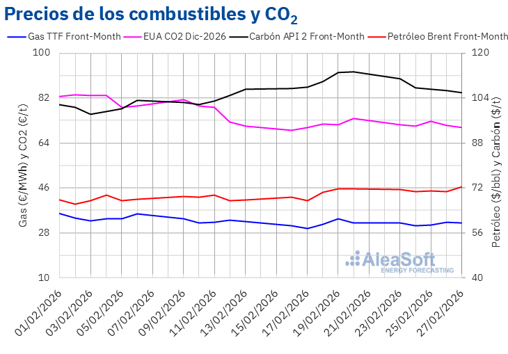 Por lo que respecta a los precios de cierre de los futuros de derechos de emisión de CO2 en el mercado EEX para el contrato de referencia de diciembre de 2026, se mantuvieron por encima de 70 €/t durante la cuarta semana de febrero. El día 25 de febrero, estos futuros alcanzaron su precio de cierre máximo semanal, de 72,60 €/t. Sin embargo, en las últimas sesiones de la semana los precios descendieron. Como consecuencia, el viernes 27 de febrero, estos futuros registraron su precio de cierre mínimo semanal, de 70,29 €/t. Según los datos analizados en AleaSoft Energy Forecasting, este precio fue un 4,7% menor al del viernes anterior.