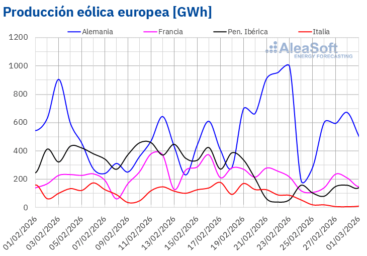 En la semana del 23 de febrero, el aumento de la producción solar y el descenso de la demanda propiciaron la caída de los precios en la mayoría de los principales mercados eléctricos europeos. Sin embargo, la notable caída de la producción eólica en la península ibérica e Italia contribuyó al incremento de los precios en los mercados español, italiano y portugués. En Portugal también descendió la producción hidroeléctrica.