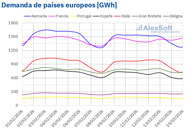Fuente: Elaborado por AleaSoft Energy Forecasting con datos de ENTSO-E, RTE, REN, Red Eléctrica y TERNA.Demanda eléctrica