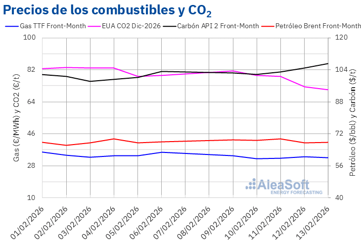 Por lo que respecta a los futuros de derechos de emisión de CO2 en el mercado EEX para el contrato de referencia de diciembre de 2026, el lunes 9 de febrero alcanzaron su precio de cierre máximo semanal, de 81,33 €/t. Posteriormente, los precios iniciaron una tendencia descendente. Como consecuencia, el viernes 13 de febrero, estos futuros registraron su precio de cierre mínimo semanal, de 70,70 €/t. Según los datos analizados en AleaSoft Energy Forecasting, este precio fue un 10% menor al del viernes anterior y el más bajo desde el 6 de mayo de 2025.
