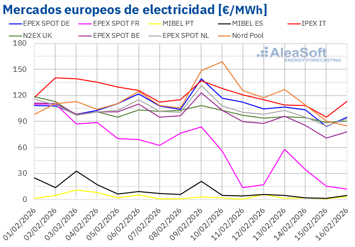AleaSoft Energy Forecasting, 16 de febrero de 2026. En la segunda semana de febrero, los precios de la mayoría de los principales mercados eléctricos europeos mantuvieron una tendencia descendente, aunque en muchos casos el promedio semanal se situó por encima de 90 €/MWh. El mercado nórdico registró el promedio semanal más elevado, algo inédito al menos desde 2018, y el 10 de febrero alcanzó su precio más alto desde 2022. El mercado ibérico continuó desacoplado del resto de Europa, con precios diarios inferiores a 5 €/MWh en la mayoría de las sesiones. En cuanto a la producción renovable, el mercado italiano marcó el mayor valor fotovoltaico para un día de febrero y el francés el mayor registro eólico para un día de febrero. Por su parte, los futuros de CO2 alcanzaron su nivel más bajo desde mayo de 2025.