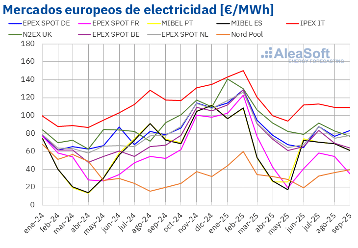 AleaSoft Energy Forecasting, 1 de octubre de 2025. Los precios de la mayoría de los principales mercados eléctricos europeos aumentaron en el tercer trimestre de 2025 y superaron los 65 €/MWh. Este comportamiento estuvo favorecido por el aumento de la demanda y el descenso de la producción eólica respecto al segundo trimestre del año en gran parte de los mercados, así como por la subida de los precios del CO2. En los mercados español, francés y portugués se alcanzó la producción fotovoltaica trimestral más alta de la historia. El precio promedio de los futuros de gas TTF durante el trimestre fue el más bajo desde el tercer trimestre de 2024.