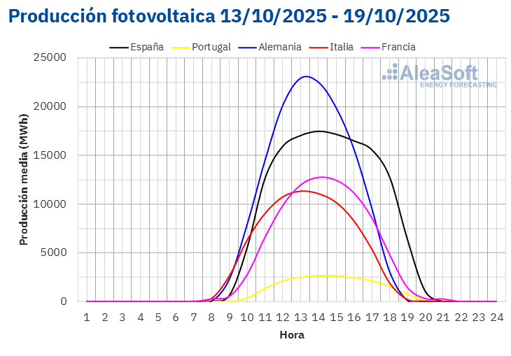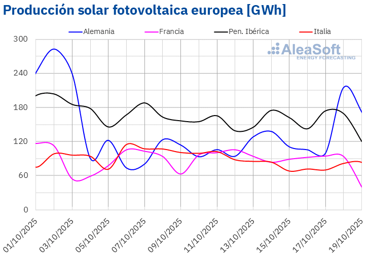 Durante la semana del 20 de octubre, según las previsiones de producción solar de AleaSoft Energy Forecasting, la tendencia a la baja continuará y la producción fotovoltaica disminuirá en los mercados italiano, alemán y español.