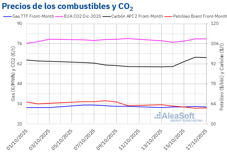 Por lo que respecta a los futuros de derechos de emisión de CO2 en el mercado EEX para el contrato de referencia de diciembre de 2025, el martes 14 de octubre, registraron su precio de cierre mínimo semanal, de 76,94 €/t. Posteriormente, los precios aumentaron. Como consecuencia, el jueves 16 de octubre, estos futuros alcanzaron su precio de cierre máximo semanal, de 79,52 €/t. El viernes 17 de octubre, el precio de cierre fue ligeramente inferior, de 79,47 €/t. Según los datos analizados en AleaSoft Energy Forecasting, este precio fue un 0,3% menor al del viernes anterior.